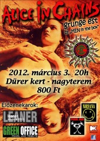 Március első szombatján a MEN in the box produkció ismételten elővezeti a halhatatlan Alice in chains dalokat, és az eddigi megmozdulásaikhoz hasonlóan ezen a napon is sok vendégzenésszel kibővülve lépnek majd színpadra. Az est nem csupán az AIC-ról, hanem a grunge-ról is szól, így két másik banda melegíti be a nagyérdeműt. A Leaner a Nirvanát, a Green Office pedig a Pearl Jamet idézi meg.