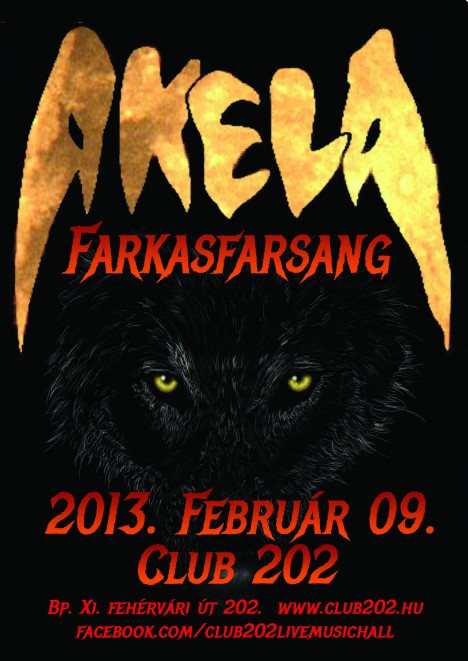 Ha nem bírnád már a telet, és úgy érzed muszáj kiengedned a hóesés okozta rengeteg stresszt és feszültséget, üvölts a holdra és metal! Ha mindezt egyedül mégsem mered, vagy csak szimplán koncertre és eszeveszettül "ereszdelahajadat" tombolni vágysz, akkor ne habozz, gyere csak február 9-én a Club 202-be, és zúzz egy izzasztóan hatalmasat Magyarország vérbeli és legendás farkascsapatával, az Akela zenekarral- mivelhogy farkasfarsang lesz, bezony, mint, ahogy ez már évek óta hagyomány. A hangulat jókedvűen vérfagyasztó lesz, és sejtelmesen jelmezes, ez alap. Jöjjön mindenki!