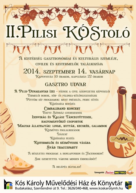 Már csupán pár nap van hátra a második Pilisi Kóstolóig. A kistérség gasztronómiai és kulturális szemléje, civilek és kistermelők találkozója azonban nem csak a kiállítóknak ígér izgalmas kikapcsolódást. A programra látogatókat rengeteg kulináris és kulturális program várja, a pilisi térség legfinomabb ételeivel és italaival: pálinka-, sör- és borkülönlegességek, táncmulatság, közös főzések, magyar kutyafajták bemutatója, sváb traccsparti, és még ezen kívül is rengeteg, a pilisi kistérség nemzetiségeit bemutató színes hagyományörző program vár kicsiket és nagyokat.
