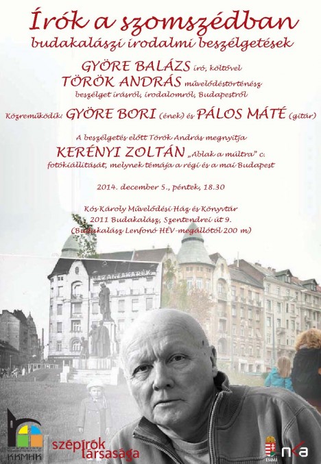 A legközelebbi, jövő pénteki Írók a szomszédban programja: Györe Balázs író-költővel beszélget Török András művelődéstörténész. A beszélgetés gyújtópontjába Györe Balázs „Hová mész Budapest?” című esszékötete, valamint versei, regényei kerülnek.