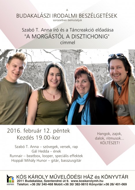 Vendégünk Szabó T. Anna költő és a Táncreakció zenei formáció. Különleges estére készüljön mindenki, hiszen egy költő, egy énekes, egy beatbox-művész, valamint egy hangszeres zenész közös, interaktív és vérbeli, improvizatív műsora szól majd, hangokból, zajokból, dalokból és persze nem mindennapi ritmusokból…