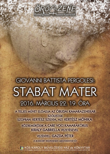 Az Örömzene koncertsorozatban Pergolesi Stabat mater című művét adja elő az Óbudai Kamarazenekar. A szólisták a darabban Kertész Szilvia és Kertész Mónika lesznek, valamint a Care Voci kamarakórus is közreműködik majd Király Gabriella vezetésével, vezényel: Gazda Péter.