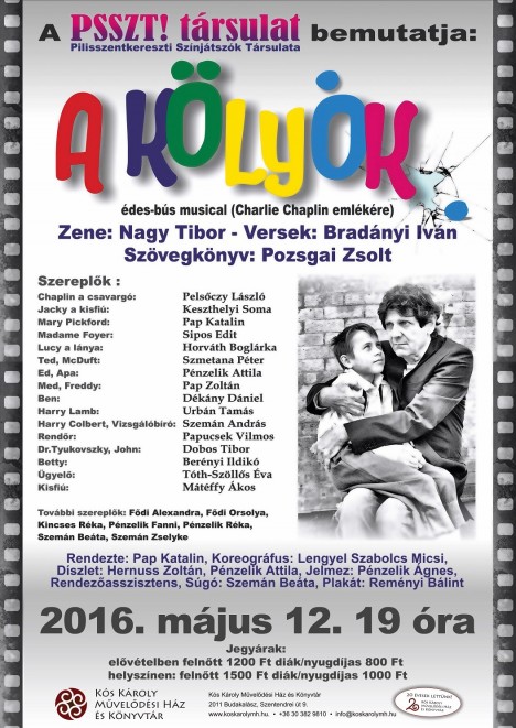 Május 12-én 19 órakor egy vidám, mégis elgondolkoztató előadás debütál Budakalászon: az „A KÖLYÖK” című édes-bús musical, amely egy Hollywood-i forgatás kerettörténetébe foglalt "The Kid" című Chaplin film színpadi adaptációja. Bár a történet amerikai, mégis mindhárom alkotója magyar. A szövegkönyvet Pozsgai Zsolt írta, Nagy Tibor pedig a darab zenéjét szerezte, míg Bradányi Ivánnak a verseket köszönhetjük. A történet komikus, ennek ellenére mélyen emberi. Talán ez elég biztosíték a sikerre.