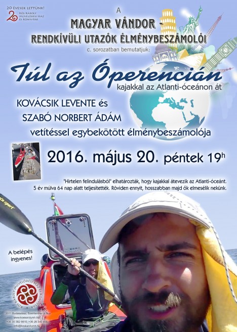 Két magyar srác 2011-ben a Balaton partján üldögélve, "hirtelen felindulásból" elhatározta, hogy kajakkal átevezik az Atlanti-óceánt. Képtelen ötletnek tűnt, de nem megvalósíthatatlannak. Persze az világcsúcs is lenne, de azért nekikezdtek. Sok-sok tervezés, szervezés, próbálkozás, kudarc és küzdelem után útnak indultak... kétszer, mert elsőre nem sikerült. Másodszorra igen. Amíg mi tavaly év végén karácsonyoztunk, ők az óceánon eveztek és nézték a végtelen látóhatárt. És 64 nap alatt eljutottak Kele nevű páros kajakjukkal Európából Amerikába! Saját szavaikkal, "saját határainkat akarjuk a végletekig feszegetni". Röviden ennyit, hosszabban majd ők elmesélik nekünk.