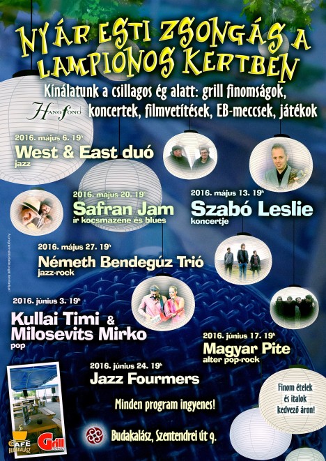 Tovább "dübörögnek" a Grill Terasz koncertjei Budakalászon! Hiszen a nyár pedig megállíthatatlanul szalad felénk: ezért a Grill Terasz Lampionos kertjének szervezői ingyenes, szabadtéri koncertekkel kedveskednének a jó időnek, na meg persze az élő zenét kedvelő közönségnek.