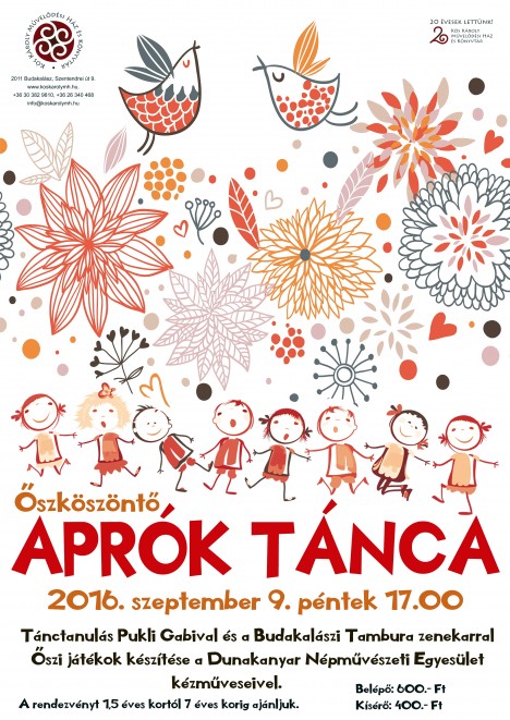 Az ősz beköszöntével újra Aprók Táncára invitálunk minden kis táncoslábút, aki szeretne a magyar néptánc és népzene varázslatában részt venni.