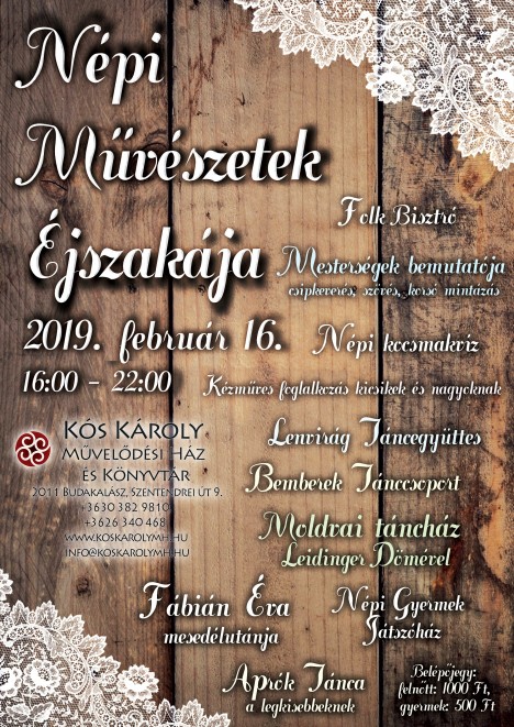 Február 16-án egy estére a népművészeteké a főszerep Budakalászon. A rendhagyó esemény persze különleges, időutazó programot kínál: délután négytől este tíz óráig jól ismert, ám ma már sokszor feledésbe merült mesterségekkel ismerkedhetnek meg az érdeklődők. Az este végén a fazekasság, a nemezelés és a csipkeverés sem lesz ismeretlen a vendégeknek, akiket a kézműveskedés mellett kocsmakvíz, táncbemutató, táncház és mesedélután is vár..