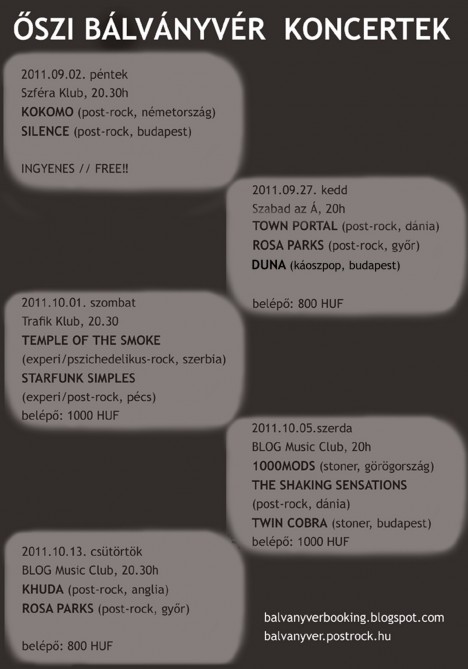 A koncertekkel kapcsolatban lásd bővebben az adott eseményt a facebook-on, vagy az alábbi két címen: