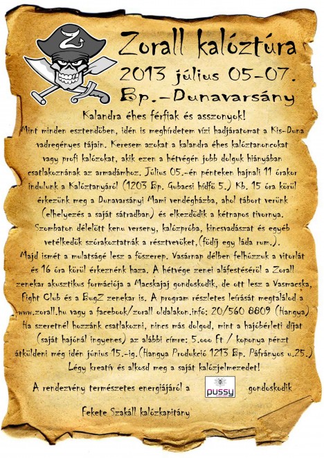 Keresem azokat a kalandozó kedvű kalóztanoncokat és profi kalózokat, akik ezen a hétvégén jobb dolguk hiányában csatlakoznának armadámhoz. Július 5-én pénteken hajnali 11 órakor indulunk a kalóztanyáról (1203 Budapest, Gubacsi hídfő 5.) Kb. 15 óra körül érkezünk meg a Dunavarsányi Mami vendégházba, ahol tábort verünk (elhelyezés a saját sátradban) és elkezdődik a kétnapos tivornya.
