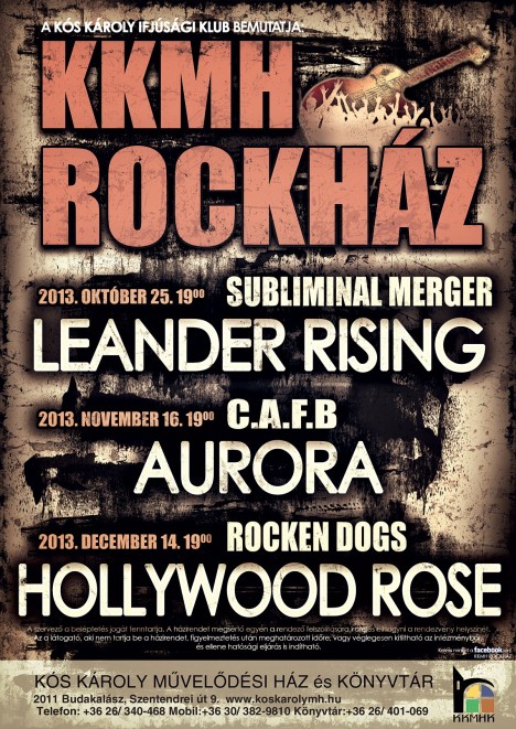 Új koncertsorozat indul a budakalászi Kós Károly Művelődési Házban, ahol feltörekvő és már nevet szerzett zenekarok alapozzák majd a rock hangulatot a havonta megrendezett klub-bulikban. A szervezők régi vágya ugyanis, hogy a hangos rockkoncertek ismét részei legyenek egy-egy művelődés ház havi programjának, ezáltal valahogy újra részese legyen az élőzene a mindennapoknak is, akárcsak a régebbi időkben volt. A fiatalok kulturált szórakozása a cél. Ehhez járul hozzá a Subliminal Merger, a manapság méltán híres popmetálos Leander Rising, a CAFB, az idén 30 éves Aurora, a Tankcsapda egykori előzenekara a Rocken Dogs és a Hollywood Rose csapata.