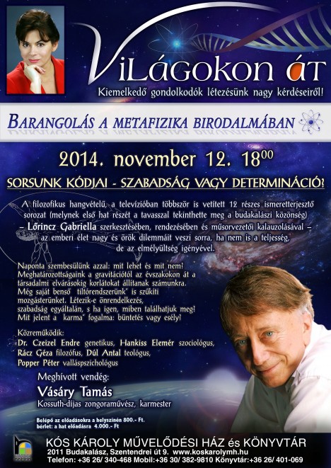 Az ősszel újra kezdődött a tavalyi szezonban annyira sikeres előadássorozat, a Világokon át, Budakalászon. A két hetente az élet megválaszolatlan, örök kérdéseivel foglalkozó program újra vár mindenkit, aki meg akarja érteni a megérthetetlent, vagy csak kicsit közelebb akar kerülni életünk, létezésünk nagy kérdőjeleinek a válaszához. Ezek az esték nem mindennapi beszélgetések, nem mindennapi előadókkal.