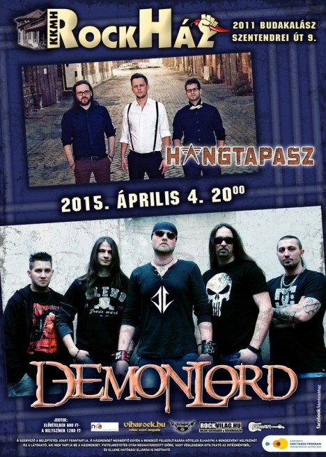 Húsvétkor újra elszabadul a buliőrület a RockHázban! Április 4.-én sokak örömére ismét a fémzene lesz az úr a városszéli rock klubban: a magyar metaltörténet oszlopos tagja, a Demonlord csapata adja majd a talpalá valót. Ezen az estén minden metal rajongó abszolút elégedett lehet, hiszen az idén már 18 éves Demonlord, és előzenekara a Hangtapasz csapata garantálja, hogy fém fémen nem marad most sem a budakalászi rock klubban.