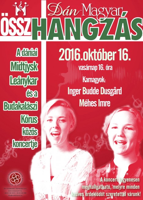 DÁN-MAGYAR ÖSSZHANGZÁS címen a dániai Midtjysk Leánykar és a Budakalászi Kórus közöskoncertje hallható 2016. október 16-án vasárnap 16 órától, a Budakalászi Művelődési Házban. A Midtjysk Leánykar a Dániát Németországgal összekötő félsziget, a gyönyörű természeti kincseiről ismert, erdőkben gazdag tenger által körbeölelt magasföld, Jütland szívéből érkezik hozzánk Silkeborg városából.