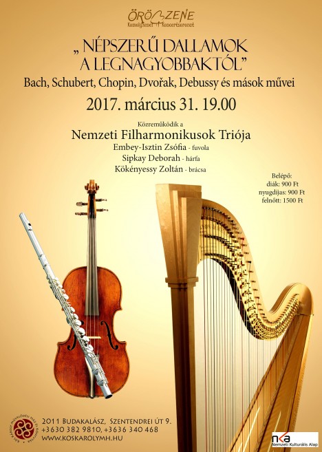 Folyatódik a budakalászi Örömzene koncertsorozat. A legközelebbi alkalom címe "Népszerű dallamok a legnagyobbaktól". Ezúttal a Nemzeti Filharmonikusok triója játszik majd többek között Bach, Schubert, Chopin, Dvorak, Debussy műveket.