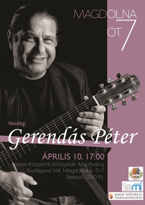 Gerendás Péter-est lesz a költészet napja előestéjén, április 10-én délután öt órai kezdettel a Vasas Központi Könyvtár Alapítvány szervezésében. Az előadóművész magyar költők verseit adja elő saját megzenésítésében. A pódiumon Ady Endre, Faludy György, József Attila, Nadányi Zoltán, Radnóti Miklós és Szabó Magda legendás strófáit kelti új életre az akusztikus gitár és az énekhang.