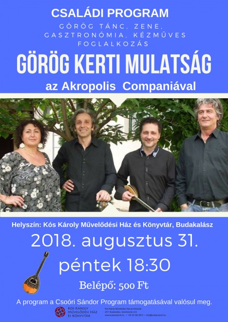A programkavalkádban a már megszokott budakalászi izgalom vár mindenkit: görög tánc és zene, görög gasztronómiai különlegességek, és persze kézműves foglalkozások, kicsiknek és nagyoknak egyaránt!