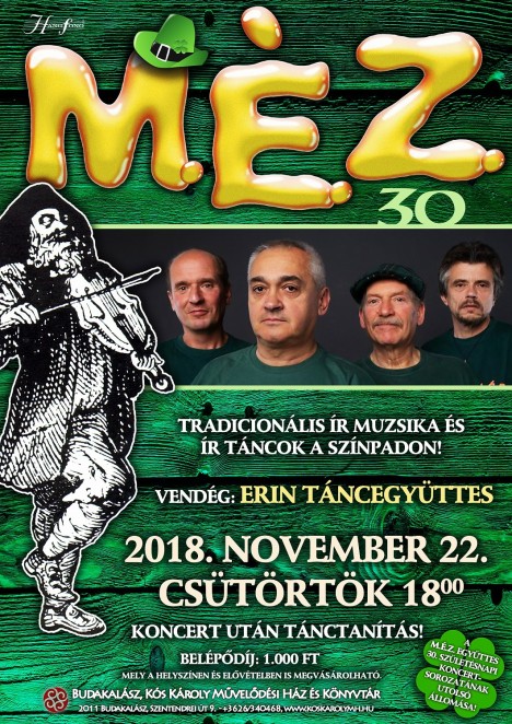 Az első magyarországi ír-skót népzenét játszó M.É.Z. együttes 30 éves lett! A zenekar évfordulós turnéjának utolsó állomásaként Budakalászon ad koncertet, melynek vendége az Erin Táncegyüttes. Tradicionális ír muzsika és ír táncok a színpadon, a koncert után pedig fergeteges ír táncház várja az érdeklődőket!