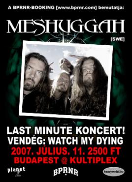 Akciós MESHUGGAH a Kultiplexben2007. július 11., Budapest, KultiplexSajnos mikor bő két éve a hajón tette tiszteletét a matek-metál legenda, nem sikerült eljutnom a bulira. Pár napja azzal kezdtem vigasztalni magam, hogy majd ősszel Bécsben egy másik elmebeteg brigáddal, a The Dillinger Escape Plannel együtt élvezhetem a svéd tanárok produkcióját. 10-én, kedden éjjel, holtfáradtan hazaérve csupán egy üzenetet akartam küldeni a Myspace-en, erre mit látok a bulletinen: a Bridge To Solace értesíti myspace-es barátait, hogy másnap Meshuggah a Kultiban.