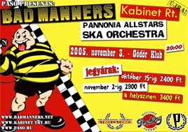 A brit legenda, az angol ska egyik valaha működött leghíresebb zenekara vélhetően tömegeket fog megmozgatni azok közül is, akik már régóta nem járnak koncertekre, hiszen a 80-as évek 2tone ska hullámának kultuszzenekara sokak számára az egyik legjobban áhított koncertélmény volt itthon, már másfél-két évtizeddel ezelőtt is. Nincs ez másként napjainkban sem, s ez most először, végre elérhető közelségbe kerül! Aki még mindig nem tudja hova tenni az eseményt, vagy ennyi nem elég ahhoz, hogy lélekszakadva rohanjon elővételes jegyet váltani, hogy biztosan beférjen az eseményre, annak további támpontként annyit még hozzáteszünk, hogy az utóbb képregényben is életre kelt Fatty (Buster Bloodvessel, a Bad Manners legendásan túlsúlyos énekese) által vezetett zenekar egy ligában zenélt a Madness-szel, vagy a 2tone kiadós Specials és Selecter zenekarokkal. Az sem elhanyagolható továbbá, hogy a rossz neveltetésben részesült brigád még ma is az egyik legmeghatározóbb és legnagyobb rajongótáborral rendelkező angol ska zenekar. Szintén ők tanították meg a fél világot ska-ra kánkánt járni, vagy ők tették elfogadhatóvá, ha egy szám refrénje egy olyan artikulátlan betűfolyamból áll, mint az, hogy "Ne-Ne Na-Na Na-Na Nu-Nu. Külön öröm, hogy még ma, 2005-ben is a színpadon láthatjuk ezt a válogatott társaságot, ugyanis Fatty a túlsúlyából adódó komoly egészségügyi problémák miatt nemrég hosszabb pihenőre kényszerült és már-már úgy tűnt, örökre búcsút kell intenie a színpadnak. Szerencsére azonban jól alakultak a dolgok, így november 3-án sor kerülhet erre a kihagyhatatlan eseményre. Senki ne szalassza el ezt az alkalmat, nem biztos, hogy később lesz módja pótlásra!